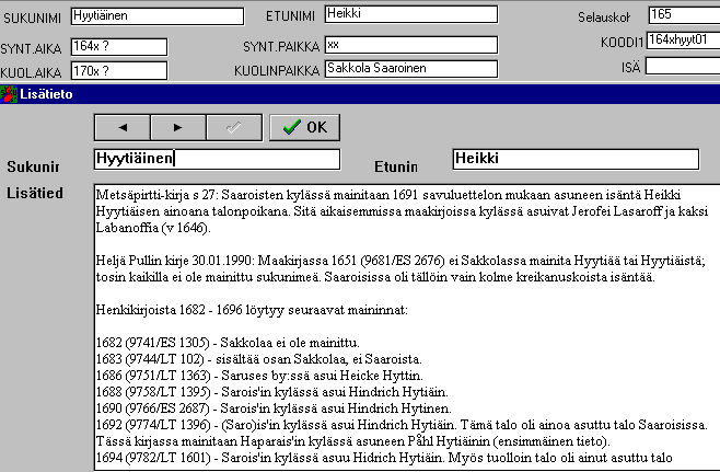 Lisätietoja: Matti 'Matz Hytiäinen' mainitaan vuoden 1689, 1695 ja 1698 tuomiokirjoissa, ensin Saaroisten kylässä, sitten Metsäpirtin kylässä ja lopulta Haaparaisten kylässä. Metsäpirtin lähteessä Matti mainitaan Martin poikana. Missä päin Martti Hyytiäinen lienee asunut? Ehkä Muolaassa. Olen tulkinnut tuomiokirjalähteiden Matin samaksi henkilöksi ja liittänyt 1700-luvun lähteissä mainitut Antti ja Matti Matinp Hyytiät tämän Matin lapsiksi. Liitäntä ei ole aivan varma.